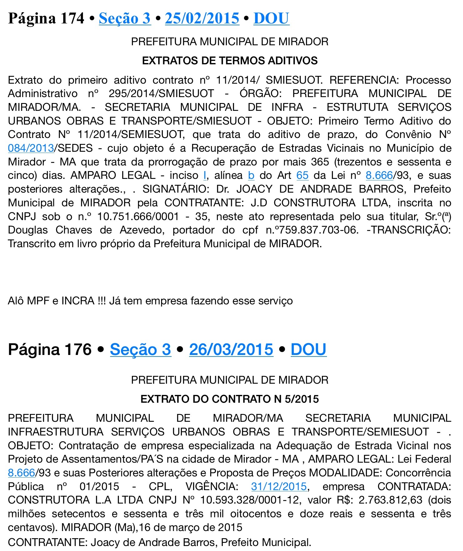 Vale ressaltar que o município de Mirador foi recentemente beneficiado pelo Governo Federal via PAC 2 com uma escavadeira, uma moniveladora, um caminhão pipa, uma caçamba e uma pá carregadeira, o que diminuiria a necessidade para tantos gastos como se vê no processo licitatório abaixo.