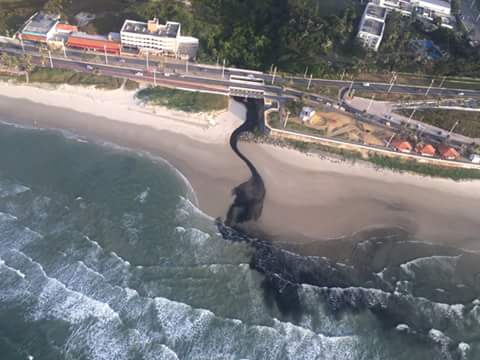 Uma mancha escura toma conta do mar na Avenida Litorânea, próximo ao parquinho onde várias crianças brincam no fim de tarde. A mancha seria a mesma que está matando o Rio Pimenta.