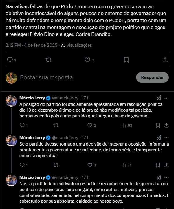 O deputado federal Márcio Jerry, presidente do PCdoB no Maranhão, usou as redes sociais para afirmar que chamar de “narrativas falsas” notícias sobre possível rompimento do partido com o governador Carlos Brandão (PSB).