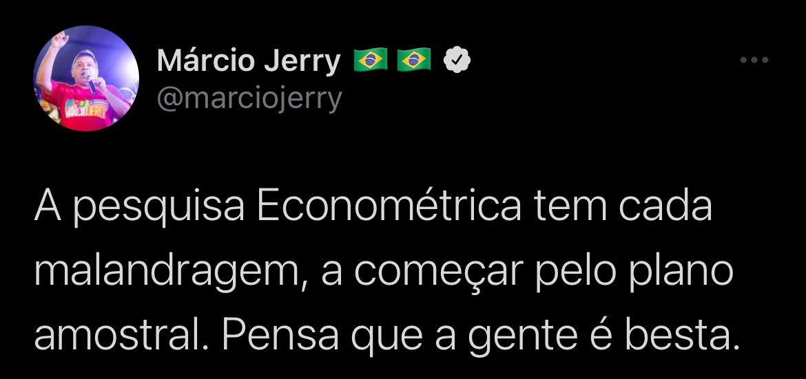 “A pesquisa Econométrica tem cada malandragem, a começar pelo plano amostral. Pensa que a gente é besta”, escreveu em sua conta no Twitter.