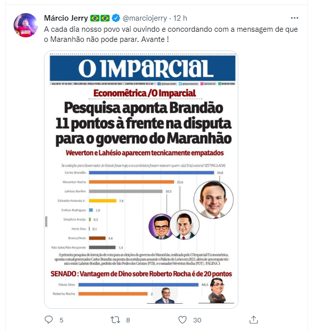 Ao que parece a opinião do deputado mudou em relação à empresa. Logo após a divulgação da pesquisa Econométrica, que favorece Brandão, Jerry tratou logo de defendê-la em suas redes sociais: “A cada dia nosso povo vai ouvindo e concordando com a mensagem de que o Maranhão não pode parar. Avante!”