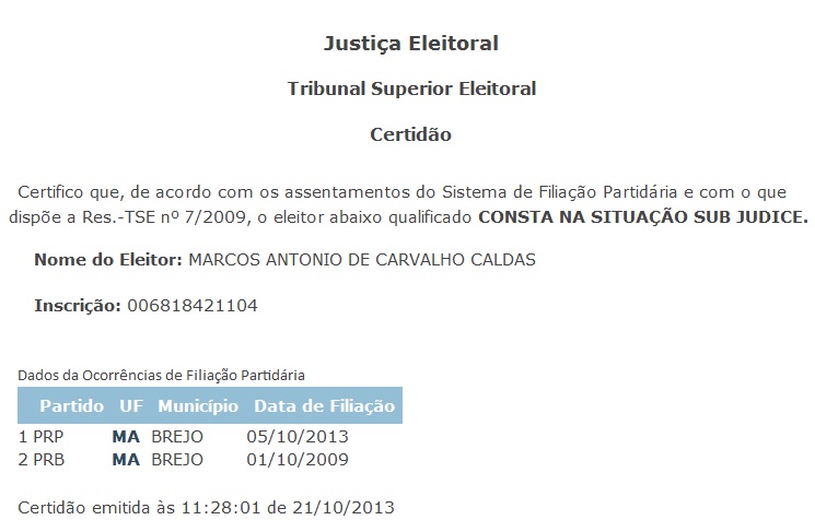 O deputado estadual Marcos Caldas, apresenta dupla filiação. Por causa disso, pode está complicando a sua candidatura a reeleição pelo (PRP). O partido é residido pelo ex-vereador de São Luís, Severino Sales.