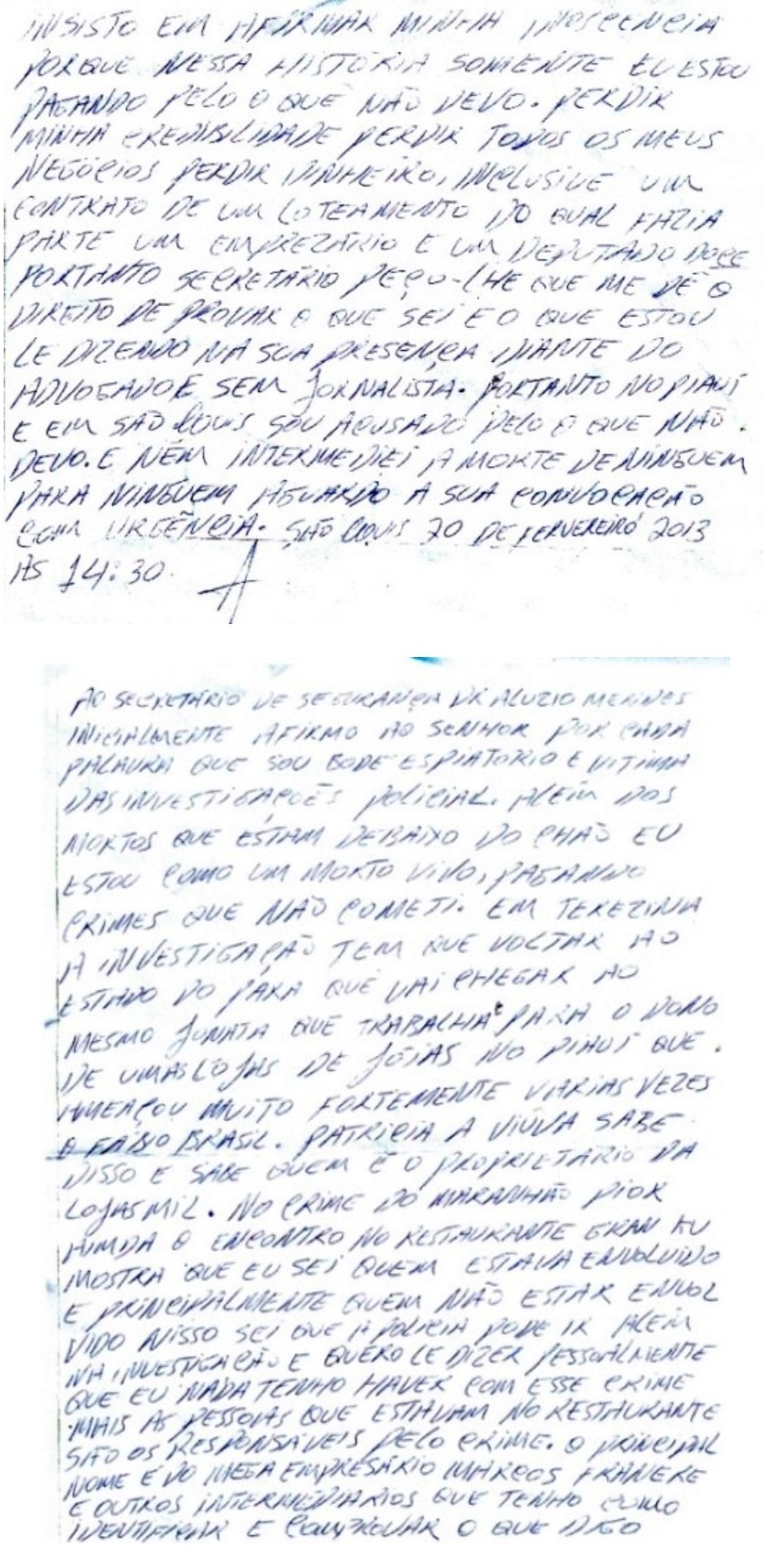 Regadas é acusado na carta de participar de reunião no restaurante Gran Ku, onde foi acertado os detalhes para realização do crime. Confira abaixo a carta.