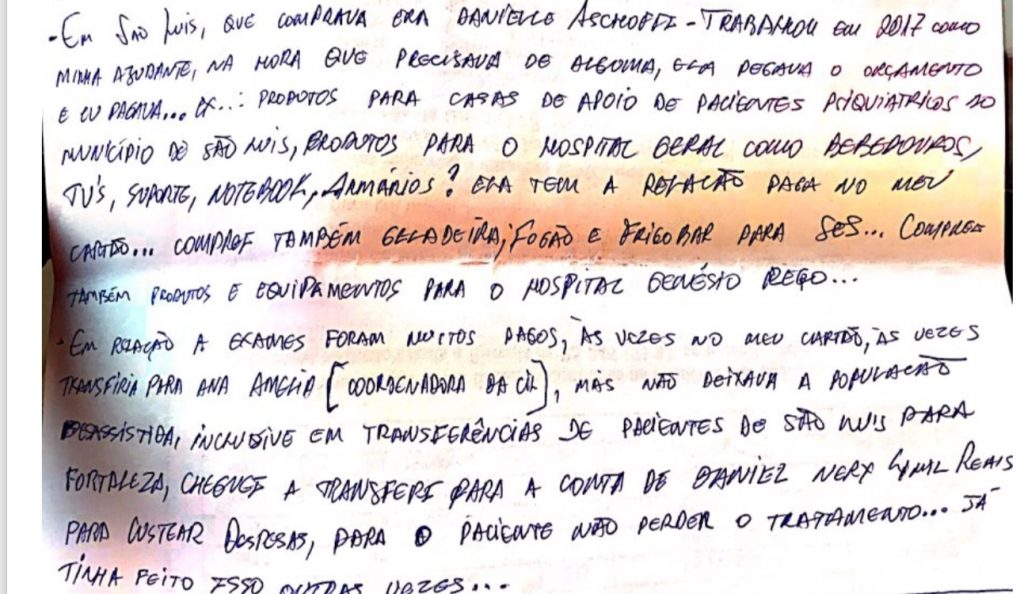 “Em são Luís, que comprava era Danielle Aschoffi – trabalhou em 2017 como minha ajudante, na hora que precisava de alguma, ela pegava o orçamento e eu pagava… Ex… Produtos para casas de apoio de pacientes psiquiátricos do município de São Luís, produtos para o hospital geral como bebedouros, suporte, notebook, armários? Ela tem a relação paga no meu cartão… Comprei também geladeira, fogão e frigobar para SES… Comprei também produtos e equipamentos para o hospital Genésio Rego…”
