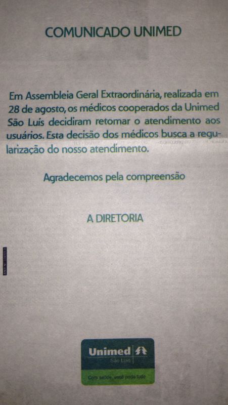 Fazendo assim a Unimed São Luís cumpre com as determinações da Agência Nacional de Saúde. (Com informações do Blog do Luis Cardoso)