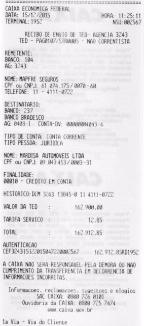 Nesse momento, autorizou a vítima a fazer o TED para a conta do proprietário do seguro da Mapfre de R$162.900 mil. Em seguida, a Débora afirmou que o empresário poderia ir buscar o carro no outro dia. Ao chegar no local, a vítima não pode levar o automóvel, pois a funcionária disse que o pagamento mão tinha sido feito. O que pode ser comprovado ao contrário devido ao comprovante da transferência.