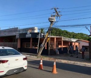 Uma motorista acabou colidindo com o carro no poste que quebrou na base. A área está sem energia elétrica, mas já há uma equipe de técnicos realizando a substituição do poste e manutenção da rede.