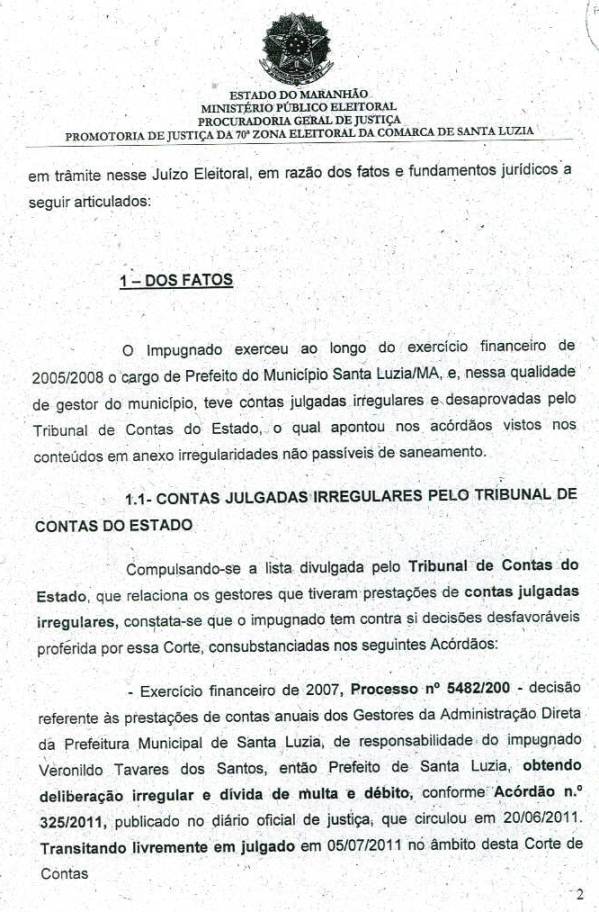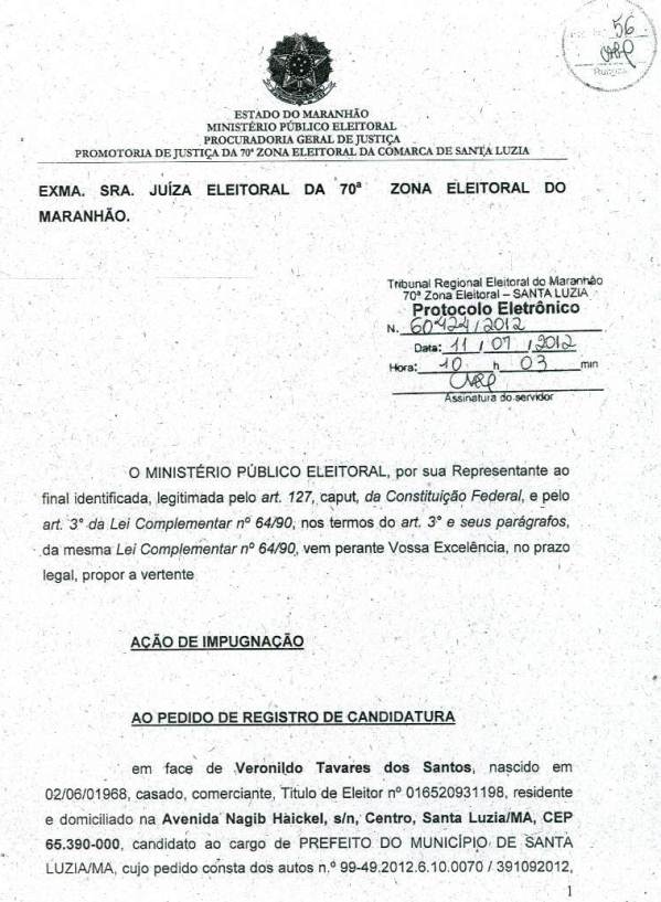 A impugnação também foi registrada na 70ª zona eleitoral de Santa Luzia no dia 11 deste mês. Abaixo o documento que pede a impugnação do candidato: