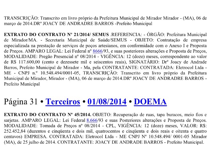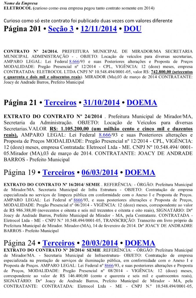 A Prefeitura de Mirador precisa explicar ao Ministério Público do Maranhão (MPMA) porque somente em 2014 a empresa Eletrocol faturou, misteriosamente, inúmeros contratos de licitação. No Diário Oficial também consta o registro de um mesmo contrato publicado duas vezes com diferentes valores.
