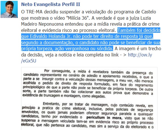 Neto Evangelista publicou em sua pagina de relacionamento (Facebook), que “segundo a documentação, o candidato não pode se beneficiar de sua própria torpeza, ação vergonhosa ou sórdida”, disse Evangelista condenando a pratica dos seus agora ex-aliados.