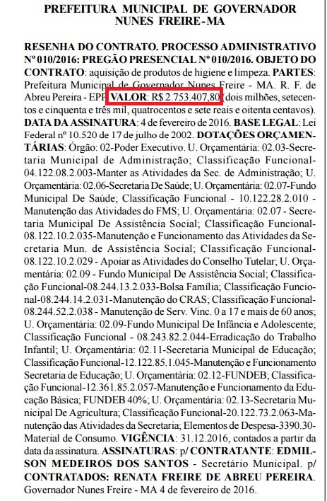 O prefeito de Governador Nunes Freire, Marcel Curió, vai fazer um grande mutirão de limpeza nos órgãos e na sede da Prefeitura. Afinal vai pagar R$ 2.753.407,80 milhões em produtos de higiene e limpeza. O contrato milionário foi celebrado entre a gestão municipal e empresa R.F. de Abreu Pereira -EPP, que deverá atender todas as necessidades da Administração Publica até o dia 31 de dezembro.