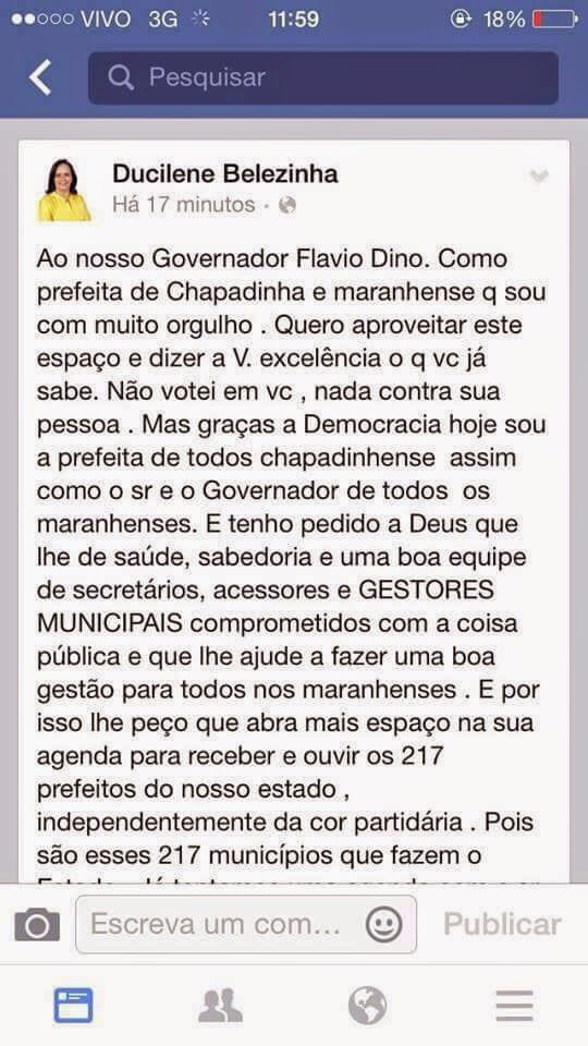 Depois de hostilizar Flávio Dino por meio da Rádio Mirante e pela renca de blogs a seu serviço, a prefeita Belezinha resolveu implorar audiência com o governador por meio do Facebook. Em tom meloso e com texto cheio de erros, Belezinha pediu um espaço na agenda de Flávio Dino, mas a postagem ficou no ar por alguns minutos e foi retirada. “E por isso peço mais espaço na agenda para receber e ouvir os 217 prefeitos do nosso estado”, apelou Belezinha, antes de deletar a própria mensagem.