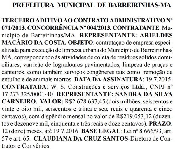 Léo Costa pretender torrar R$ 2.628.637,45 (dois milhões, seiscentos e vinte e oito mil, seiscentos e trinta e sete reais e quarenta e cincocentavos), num prazo de 12 meses para execução do serviço, com término no dia 19 de julho de 2016. A limpeza foi aditivada pela terceira vez e a empresa agraciada é a W. S. Construções e Serviços Ltda, que firmou o contrato no dia 19 de julho deste. Blog do Luis Pablo