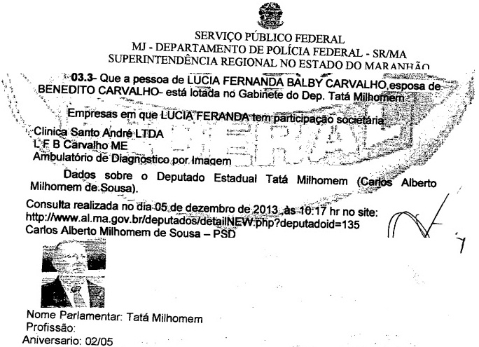 O ex-parlamentar Calor Alberto, mas conhecido como Tatá Milhomem, não conseguiu ser eleito no pleito de 2010, mas assumiu cargo na Assembleia como suplente de um deputado estadual. A companheira de Benedito Carvalho também tinha participação societária nas empresas Clínica Santo André Ltda., L F B Carvalho ME, e Ambulatório de Diagnóstico por Imagem Maiobão Ltda. Todas investigadas pela Polícia Federal apontadas como integrantes do esquema fraudulento que desviou bilhões dos cofres da Saúde do Maranhão.
