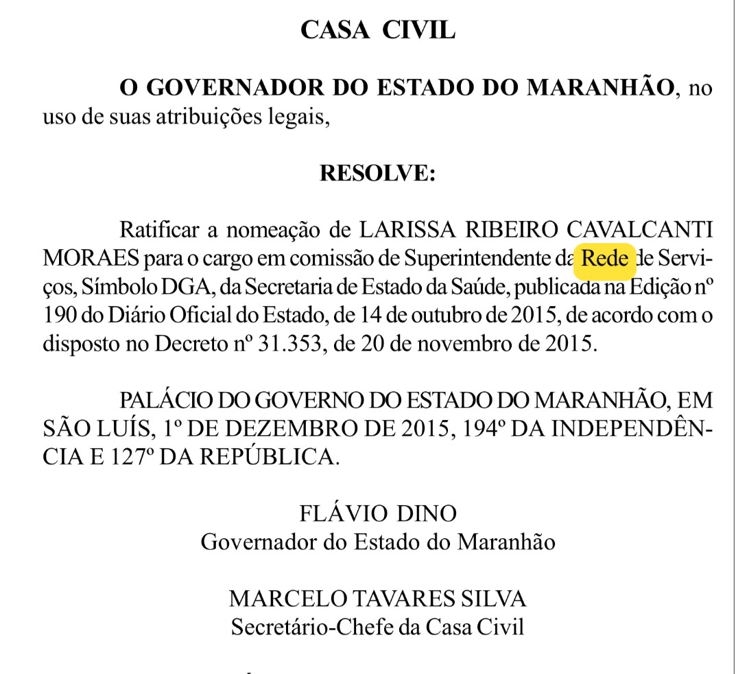 O diretor do Hospital do Câncer – Tarquínio Lopes ou Geral, José Maria Assunção Moraes Júnior, em outubro desse ano, conseguiu nomear a sua esposa, Larissa Ribeiro Cavalcanti Moraes, para uma dos principais cargos da Secretaria Estadual de Saúde, segundo consta no decreto da Casa Civil, publicado no Diário Oficial do Maranhão.