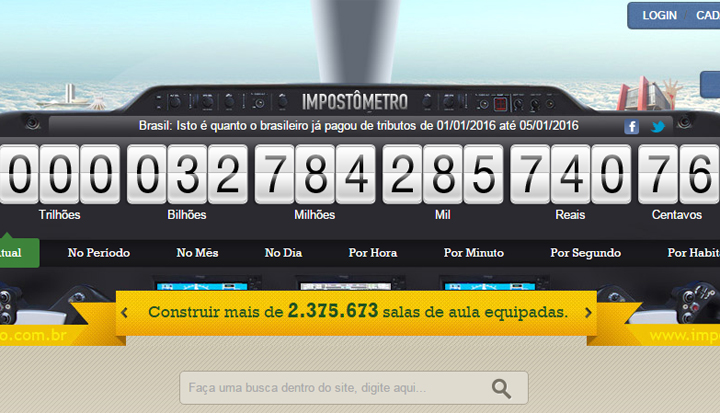O valor registrado este ano já é maior do que o registrado nos primeiros cinco dias de 2015, que registrou a arrecadação de R$ 32.280.316.014.41 em impostos. painel eletrônico do Impostômetro calcula a arrecadação em tempo real na sede da associação, em São Paulo, e através do portal www.impostometro.com.br. A ferramenta tem o objetivo de conscientizar o cidadão sobre a alta carga tributária e incentivá-lo a cobrar serviços públicos de qualidade. (Com informações do Imirante)