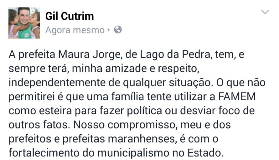 Em postagem nas suas redes sociais, o presidente da FAMEM, prefeito Gil Cutrim (São José de Ribamar), mandou um recado direto ao ex-secretário Ricardo Murad e sua filha, deputada Andréa Murad. “A prefeita Maura Jorge, de Lago da Pedra, tem, e sempre terá, minha amizade e respeito, independentemente de qualquer situação. O que não permitirei é que uma família tente utilizar a FAMEM como esteira para fazer política ou desviar foco de outros fatos. Nosso compromisso, meu e dos prefeitos e prefeitas maranhenses, é com o fortalecimento do municipalismo no Estado”, escreveu Cutrim em sua fan page.