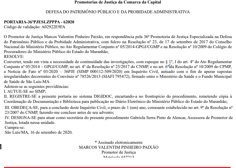 Segundo documento obtido pelo Blog do Neto Ferreira, o inquérito foi instaurado a partir da conversão da Notícia de Fato nº 03/2020 – 36PJE, que apontou uma série de supostas irregularidades no Convênio firmado entre o Ministério da Saúde e o Fundo Municipal de Saúde de São Luís, administrado pela Prefeitura da capital maranhense.