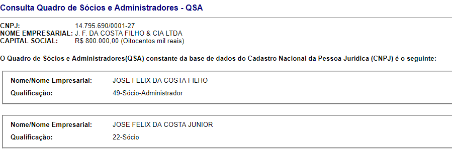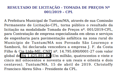 A construtora, que tem como sócios José Félix da Costa Filho e José Félix da Costa Júnior, colocará asfalto nos Povoados São Lourenço e Samborá, de acordo com o extrato contratual.