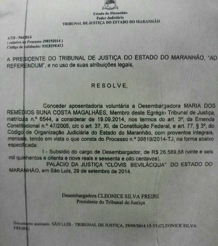 Maria dos Remédios Buna Magalhães que dedicou-se 29 anos à justiça de 1º. grau e outros 10 anos como desembargadora, se despediu da magistratura com grandes benefícios e regalias.