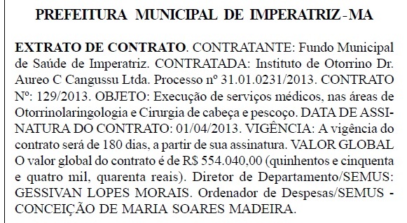 Prova disto, foi o mais recente contrato feito pelo diretor Gessivan Lopes Morais, lotado na Secretaria de Saúde, com a empresa Instituto de otorrino Dr. Aureo C Cangussu Ltda., para prestação de serviços médicos nas áreas de Otorrinolaringologia e Cirurgia de cabeça e pescoço.