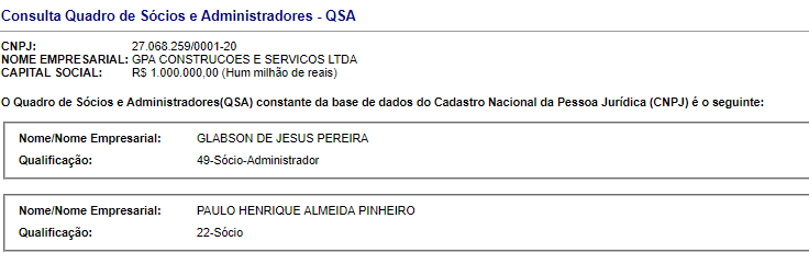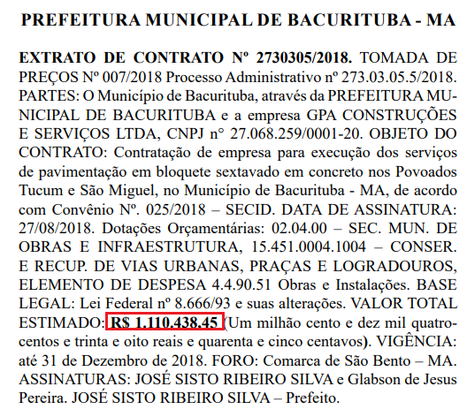 R$ 1.110.438,45 (Um milhão cento e dez mil quatrocentos e trinta e oito reais e quarenta e cinco centavos). Esse é o valor exato que a Prefeitura de Bacurituba vai pagar à GPA Construções e Serviços Ltda, localizada na Raposa e de propriedade de Glabson de Jesus Pereira e Paulo Henrique Almeida Pinheiro.