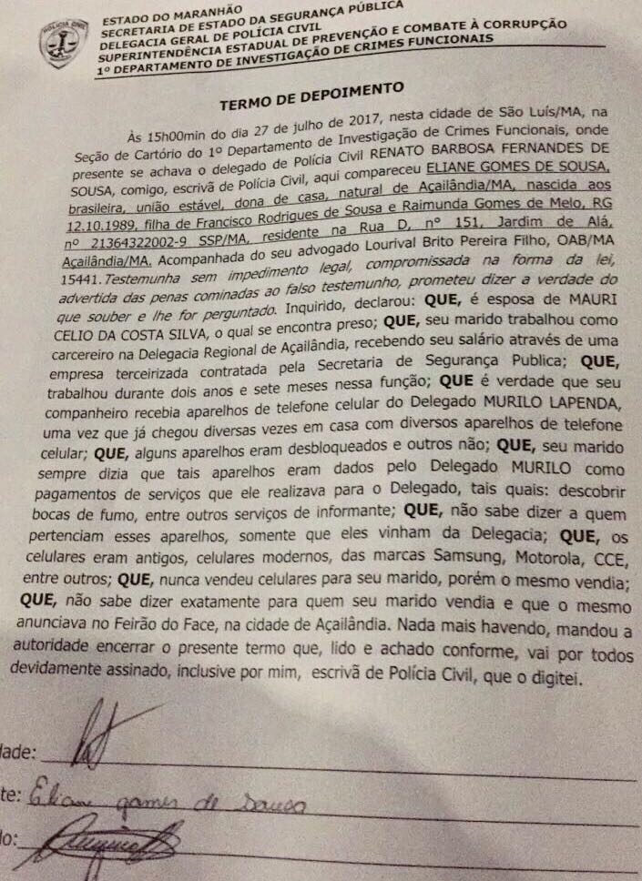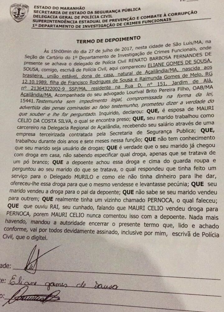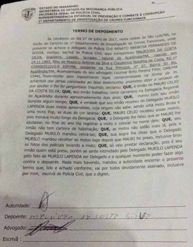 Os relatos fazem parte de uma investigação feita pela Seccor, que iniciou após Mauri Silva delatar um suposto esquema montado pelo delegado regional Murillo Lapenda para incriminar o delegado titular do 1º DP de Açailândia, Tiago Fellipini