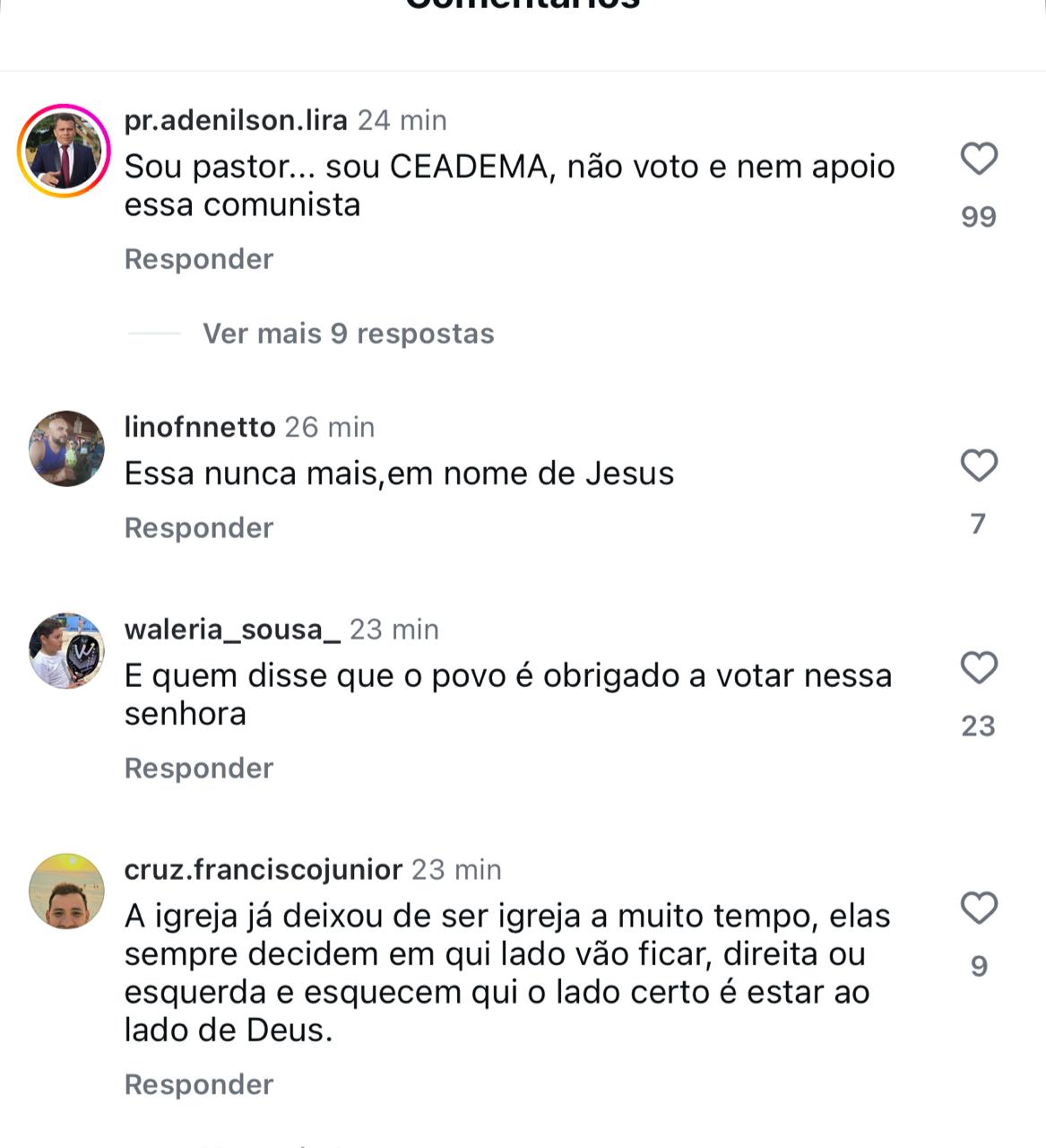 A reação negativa dos evangélicos foi imediata. O pastor Adenilson Lira não gostou e afirmou que não vota em Eliziane: “sou Ceadema, não voto e nem apoio essa comunista”.