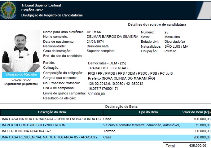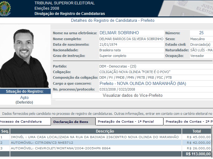 O valor da declaração de bens de Delmar Sobrinho é 300% maior do que aquela apresentada por ele na última eleição de 2008, antes de assumir a Prefeitura de Nova Olinda do Maranhão. De aproximadamente R$ 113 mil resultantes da soma de uma residência no centro de Nova Olinda, veículos Citroen C3 e Montana 2004/2005.