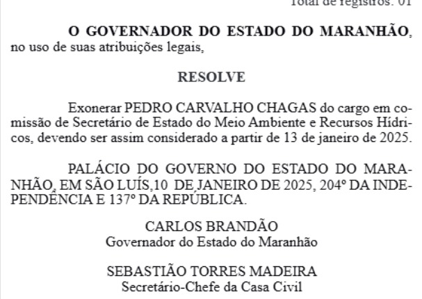 O secretário estadual de Meio Ambiente do governo Carlos Brandão (PSB), Pedro Chagas, foi exonerado do cargo.