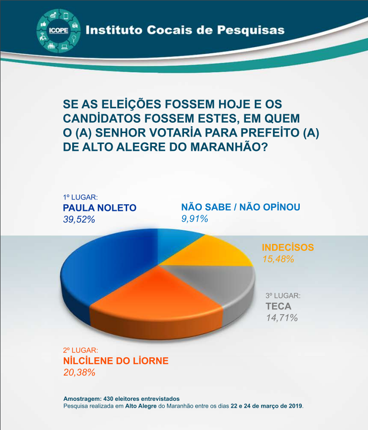 De acordo com o Icop, Noleto alcançou 39,52% das intenções de votos. Em segundo lugar lugar ficou Nilcilene do Liorne com 20,38%, em terceiro vem Teca 14,71%. Os indecisos somaram 15,48% e não sabe/Não opinou ficou com 9,91%.