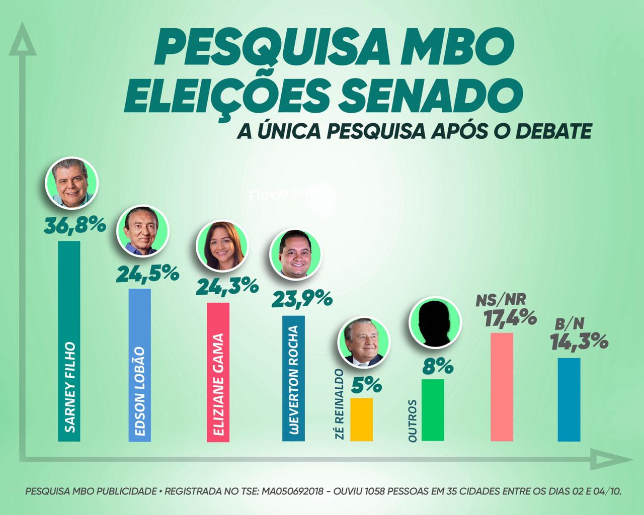 Levantamento da MBO Publicidade mostra Sarney Filho no topo das intenções de votos para o Senado. Ele lidera com 36,8% das intenções de voto na disputa ao Senado no Maranhão.