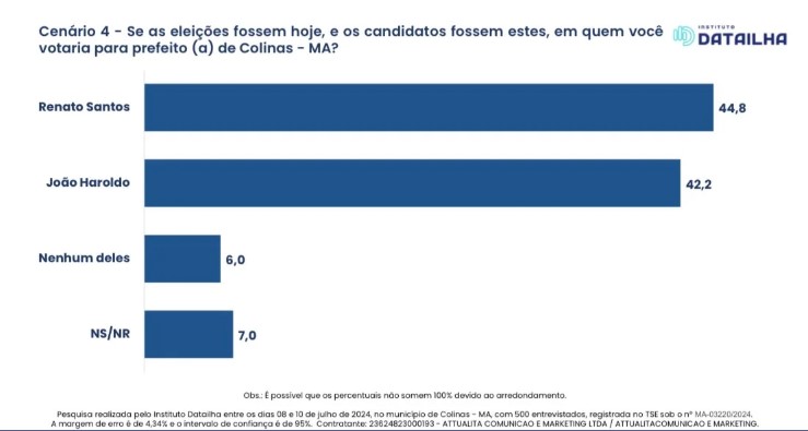 Divulgada pelo Instituto Data Ilha, a pesquisa sobre a disputa eleitoral pela Prefeitura de Colinas mostra um empate técnico entre o vereador Renato Santos e vice-prefeito João Haroldo.