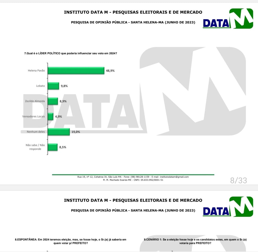 Uma pesquisa de intenção de votos para prefeito do município de Santa Helena, na Baixada Maranhense, realizada pelo Instituto DataM comprova que o “Grupo 14” está além de firme, forte e unido, bem conceituado e aprovado popularmente. O levantamento feito agora no mês de junho mostra Joãozinho Pavão, atual vice-prefeito da cidade, liderando com folga a preferência do eleitor para prefeito nas eleições de 2024, em todas as situações.