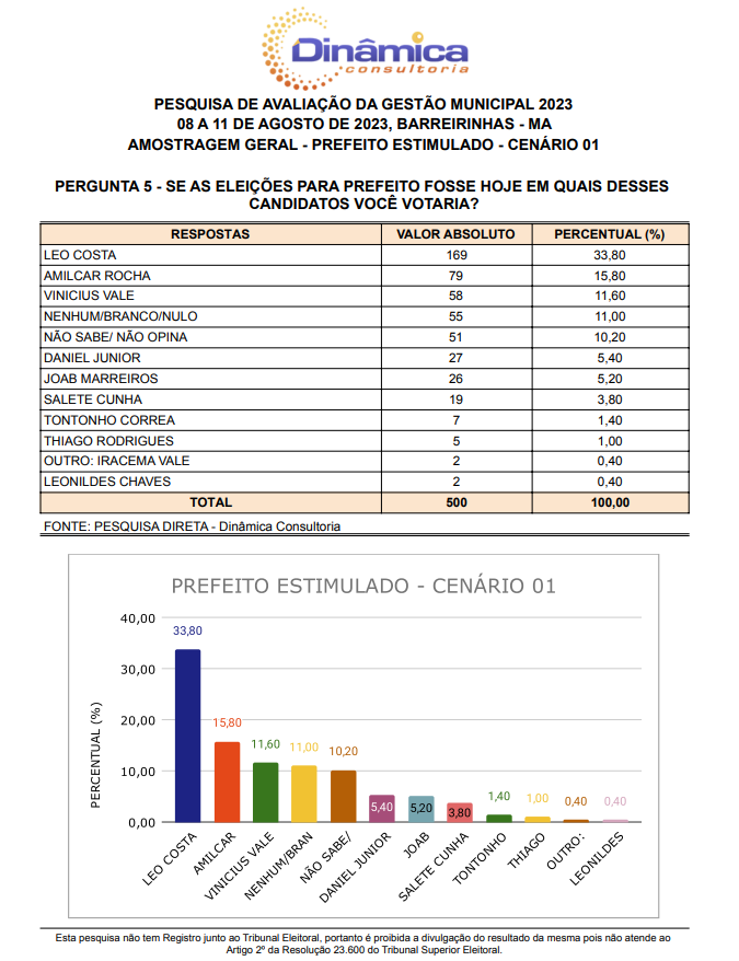 O Instituto Dinâmica Consultoria divulgou nesta terça-feira (29) uma nova pesquisa que mostra o real cenário da corrida eleitoral de Barreirinhas.