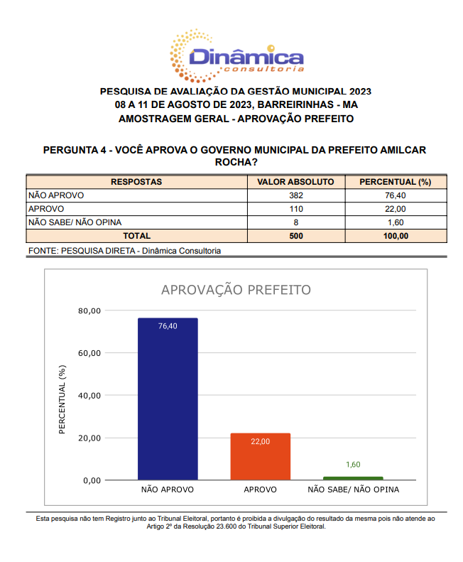 O Instituto Dinâmica também quis saber dos eleitores sobre a gestão de Amílcar em Barreirinhas.
