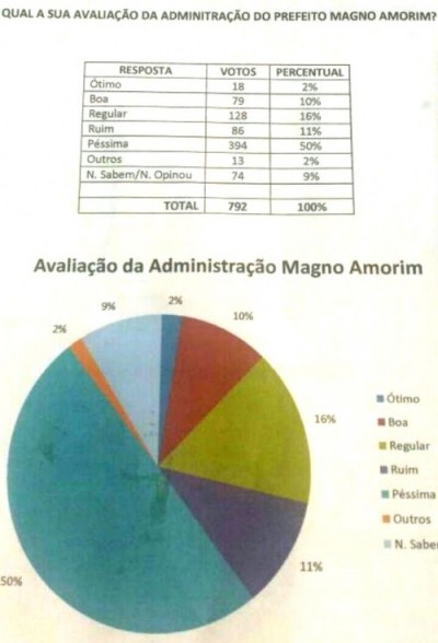 O atual prefeito da cidade, Magno Amorim foi avaliado pela população e apenas dois por cento considera sua atuação ótima. Seguida de dez por cento que qualificam a gestão como boa e dezesseis por cento que assimilam a administração como regular.