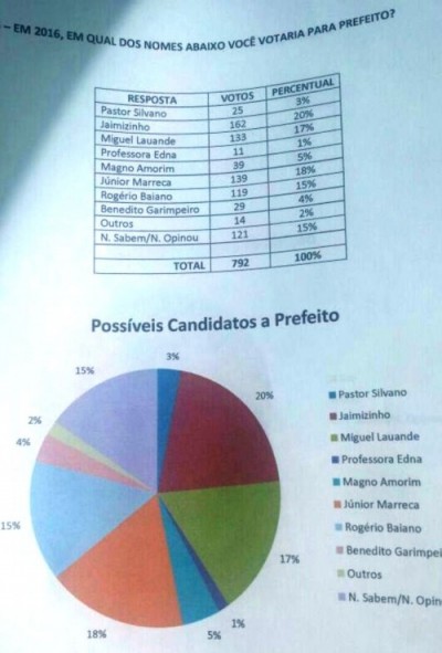 Entre os cenários de abordagem da pesquisa aparecem os nomes de possíveis prefeitos, que poderiam ser votados para as eleições municipais de 2016. Lidera o ranking Jaimizinho, com vinte por cento das intenções de voto, seguido de Júnior Marreca, na segunda posição com dezoito por cento e Miguel Lauande, terceiro colocado, com dezessete por cento.