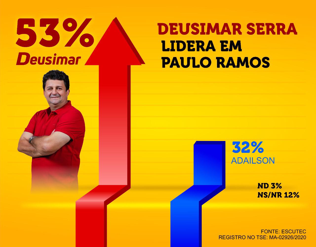 Nesta terça-feira (29), o Instituto Escutec divulgou uma pesquisa onde aponta que o atual prefeito, Deusimar Serra, lidera a corrida eleitoral com 53%, seguido do candidato Adailson Machado que atingiu a marca de 32%.
