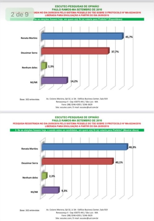 Segundo a coligação “A Força da Mudança, encabeçada pelo candidato Adailson Machado, há uma enorme suspeita do levantamento ter sido fraudado. O motivo? É que em 2016, o mesmo Instituto realizou uma sondagem em Paulo Ramos onde apontou a vitória da candidata Renata Martins. Veja abaixo: