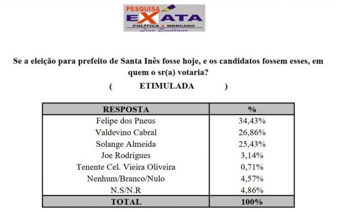 Pesquisa divulgada pelo Instituto Exata, nesta quarta-feira (6), detalha a atual situação do cenário eleitoral de Santa Inês.
