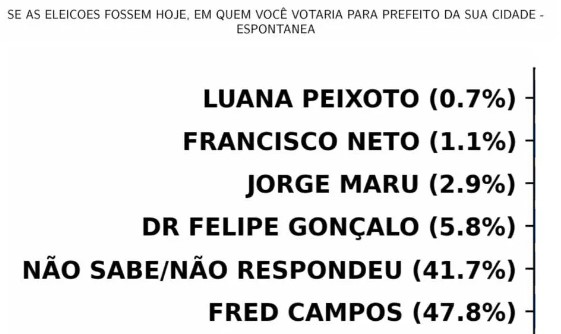 No cenário espontâneo, quando as perguntas aos entrevistados não são apresentados os nomes dos candidatos, Fred campos possui 47,8%, o segundo colocado é Felipe Gonçalo com 5,8%, Jorge Maru tem 2,9%, Francisco Neto 1,1% e Luana Peixoto 0,7%. Os que não sabem ou não responderam chegam a 41,7%.