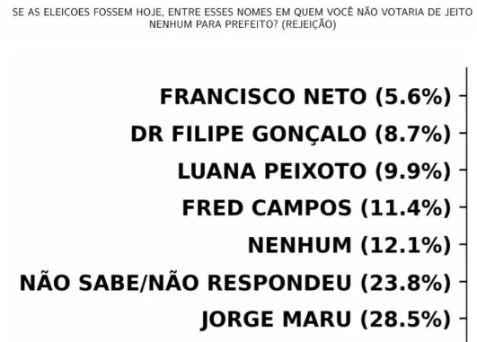 A empresa Contato Pesquisa LTDA também quis saber qual o candidato mais rejeitado pela população luminense, nesse cenário Jorge Maru lidera com 28,5%, Fred Campos tem 11,4%, Luana Peixoto 9,9%, Dr Felipe Gonçalo 8,7% e Francisco Neto 5,6%. A opção “nenhum deles” somou 12,1% e não sabem ou não responderam 23,8%.