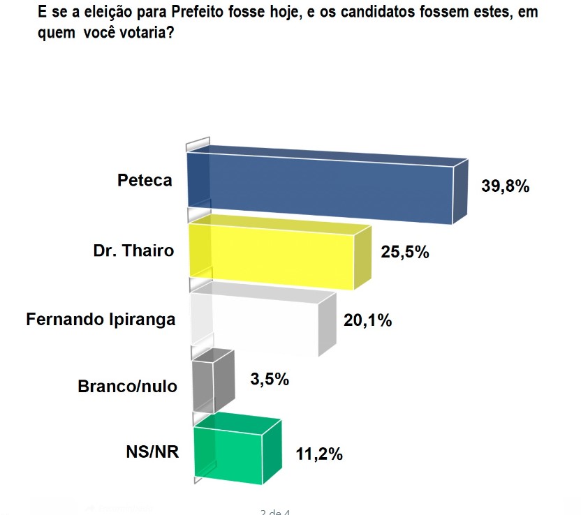 Já na percepção popular de quem pode realmente vencer as eleições, vantagem para o atual prefeito Peteca com 40,9%,seguido pelo Dr. Thairo com 21,6%, ficando em terceiro lugar o empresário Fernando Ipiranga com 17,0%.