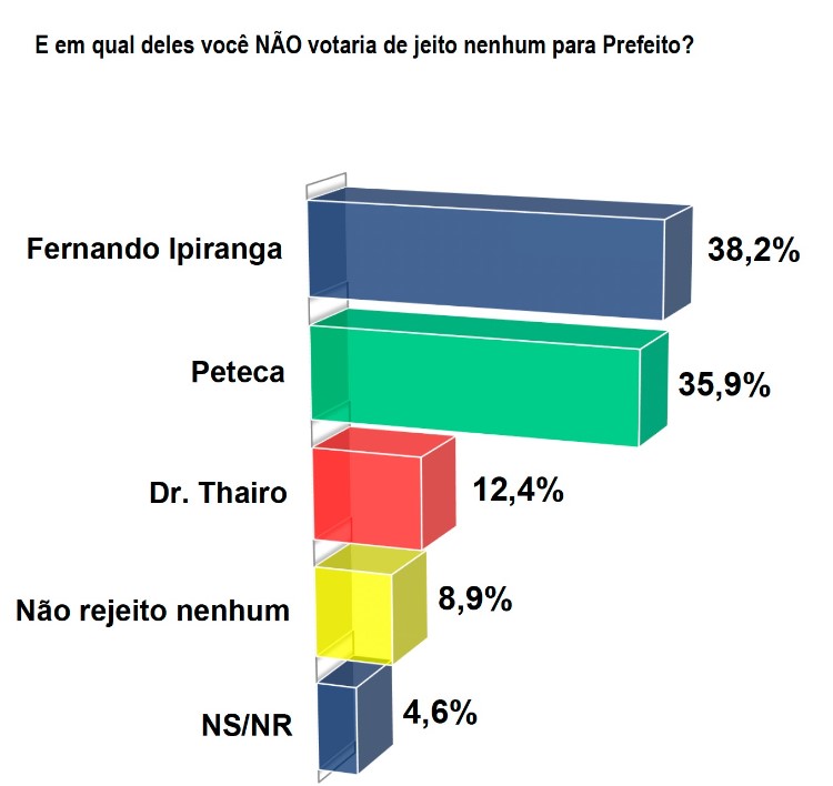 Nos índices de rejeição – em quem os eleitores não votariam de jeito nenhum – apurados pela pesquisa, Fernando Ipiranga lidera com 38,2%, seguido pelo prefeito Peteca com 35,9% e o Dr. Thairo aparece com 12,4%.