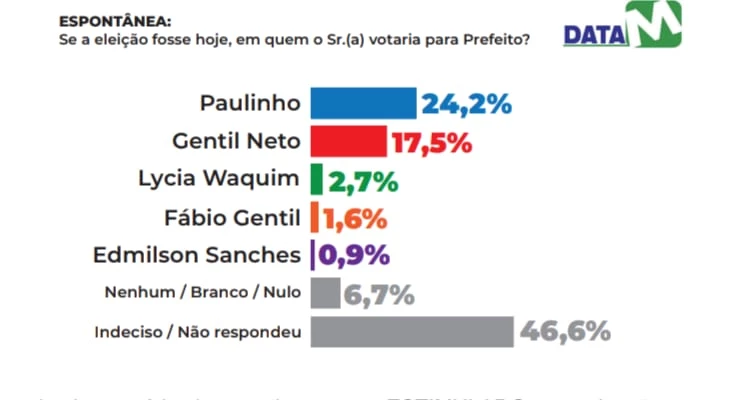 O primeiro cenário apresentado é o espontâneo (quando não é apresentado nome de candidatos ao eleitor). Assim, a DataM mostra que a disputa lá está assim: Paulo Marinho Júnior aparece com 24,2% seguido por Gentil Neto (PP) com 17,5%, depois Lycia Waquim com 2,7%, Fábio Gentil (atual prefeito) com 1,6% e Edmilson Sanches, 0,9%. Nenhum, branco e nulo somam 6,7% e indecisos e não responderam 46,6%.