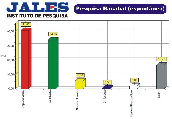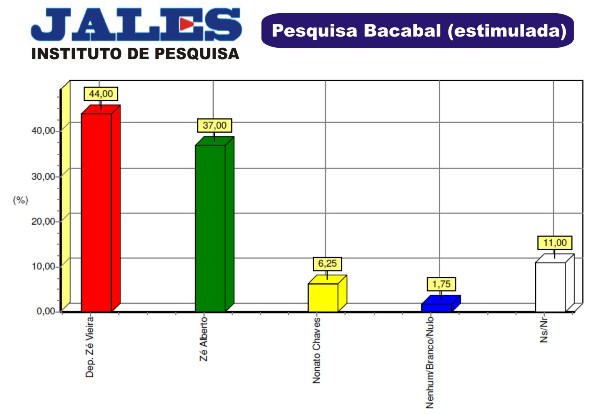 Na modalidade da pergunta estimulada, onde são apresentados os nomes dos candidatos para o eleitor, Zé Vieira continua em primeiro com 44% contra 37% de Zé Alberto, candidato do senador João Alberto. Aqueles que dizem que não sabem em quem vão votar e os que não responderam, totalizam 11 por cento. A pesquisa foi registrada no TRE/MA sob o procolo 00173/2012.