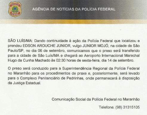 PF emite nota sobre ex-vereador Júnior do Mojó 12/09/201212/09/2012 | PÁGINA PRINCIPAL, Notícias Navegação de Post Leitor diz que pessoas ligadas ao agiota Gláucio estão ameaçando testemunhasTadeu Palácio continua na briga pela Prefeitura de São Luís