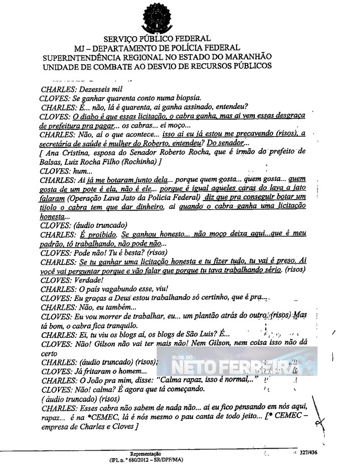 No diálogo, Charles conversa com Cloves sobre fraudes, comentam que superfaturam os valores de exames cobrados na unidade hospitalar de Balsas. Em um dos trechos da conversa Cloves fala que apesar de ganhar a mais em cima dos valores reais das consulta, eles tem que pagar à prefeitura. No entanto Charles afirma que já está se precavendo. “Não, aí o que acontece… isso ai já estou me precavendo (risos), a secretária de saúde é mulher de Roberto, entendeu? Do senador…”