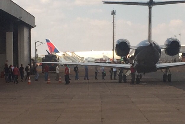 Pelo menos 20 agentes embarcaram no jato operacional da Polícia Federal, que estava no hangar na tarde de ontem domingo (23), no aeroporto de Brasília. A imagem capturada por um leitor do Blog do Neto Ferreira, mostra os federais em fileira subindo na aeronave.